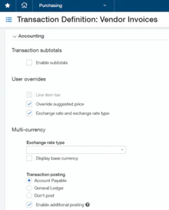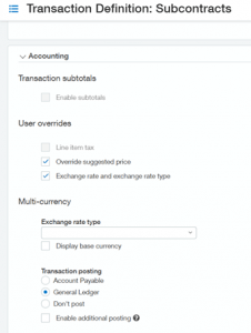 Set up your Transaction Definitions. In our example, we are purchasing for subcontracts so we will have two Transactions Definitions created (Purchase Order Subcontract and Vendor Invoice).
