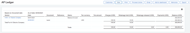 Guide to Configuring Retainage in Sage Intacct. This step shows the AP Ledger showing Retainage Held