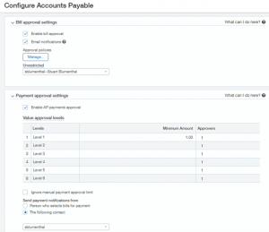 - In Accounts Payable Configuration, make sure to update the Bill Approval Settings by reviewing the Approval Policies and the Unrestricted User. Also, review the Payment Approval Settings and the person setup for “Send payment notifications from”