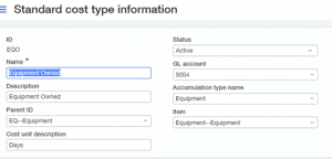 - When setting up your Cost Types, we recommend you associate each type with a GL Account Number and Non-Inventory Item. This makes sure your GL Postings and Dimension Postings are correct and consistent. Remember that Cost Codes and Cost Types also post against their own Dimensions for each transaction in the General Ledger.