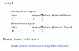 If you find that you are getting logged out of the system too fast or you want the system to log you out when automatically, set the Signout Hours Duration. You can also have Sage Intacct work with your Windows Desktop Notifications and warn you about timeouts there.
