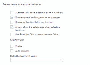 - Fast-entry row: Controls the number of blank lines used for splitting the transaction across two or more account-department-location combinations (applies to fast-entry bills, checks, and invoices pages).
